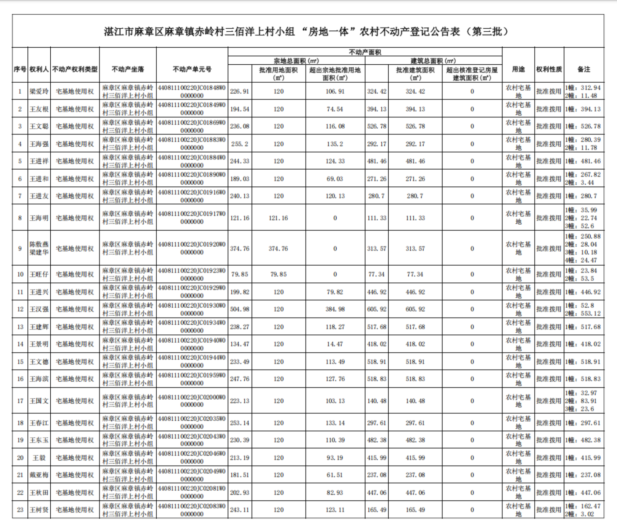 附表:麻章区麻章镇赤岭村委会三佰洋上村小组“房地一体”农村不动产登记公告表(第三批)