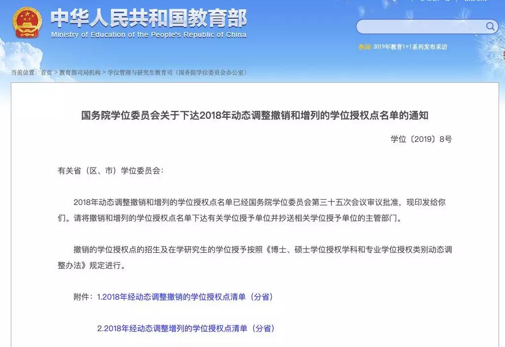5月24日,国务院学位委员会正式公布了《关于下达2018年动态调整撤销和增列的学位授权点名单的通知》公布了2018年全国多所大学学位授权点的调整、增列和撤销情况。