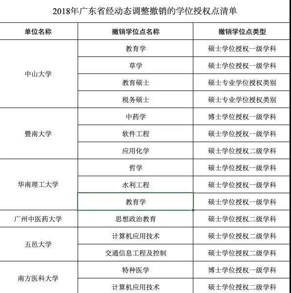 另外,还有广州中医药大学撤销了思想政治教育1个硕士学位点;五邑大学撤销计算机应用技术、交通信息工程及控制2个硕士学位点;南方医科大学撤销特种医学1个博士学位点和计算机应用技术1个硕士学位点。