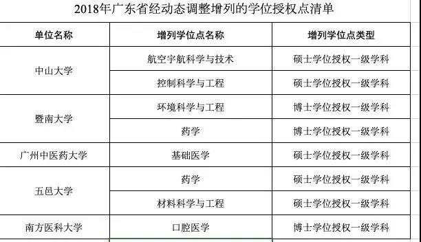此次公布的《2018年广东省经动态调整增列的学位授权点清单》则显示,广东还有5所高校增列8个学位点,包括5个硕士学位授权一级学科和3个博士学位授权一级学科。具体情况为:中山大学新增航空宇航科学与技术、控制科学与工程2个硕士学位授权一级学科;暨南大学新增环境科学与工程、药学2个博士学位授权一级学科;广州中医药大学新增基础医学1个硕士学位授权一级学科;五邑大学新增2个硕士学位授权一级学科,分别为药学、材料科学与工程。南方医科大学则新增口腔医学1个博士学位授权一级学科。