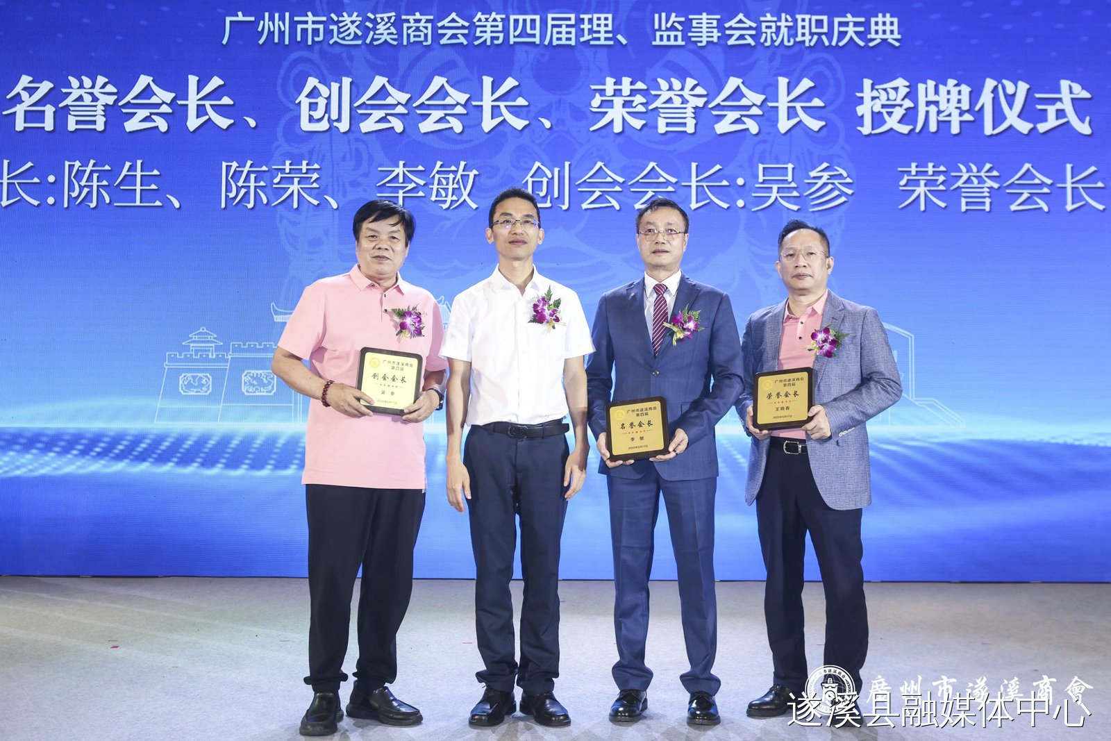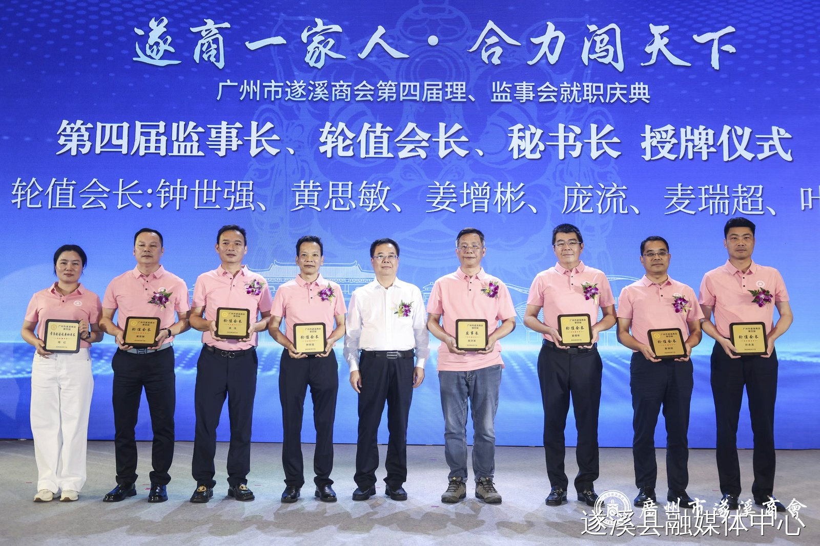 骆华庆、沈东宇、潘汝权等县领导分别为广州市遂溪商会第四届会长、名誉会长、创会会长、荣誉会长、监事长、轮值会长、秘书长、常务副会长、副会长、会员颁发牌匾证书。
