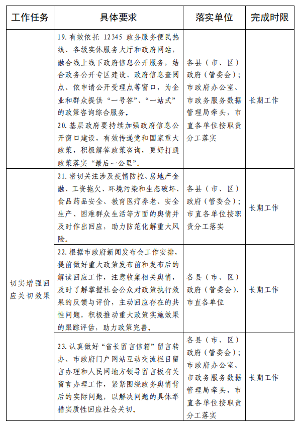二、各牵头单位要切实扛起牵头抓总职责,主动加强与上级有关部门的请示对接,加强对本系统政务公开工作的指导,协调责任单位同向发力,按时保质保量完成各项工作任务,并于10月30日前收集汇总所牵头工作任务开展情况,报市政府办公室。