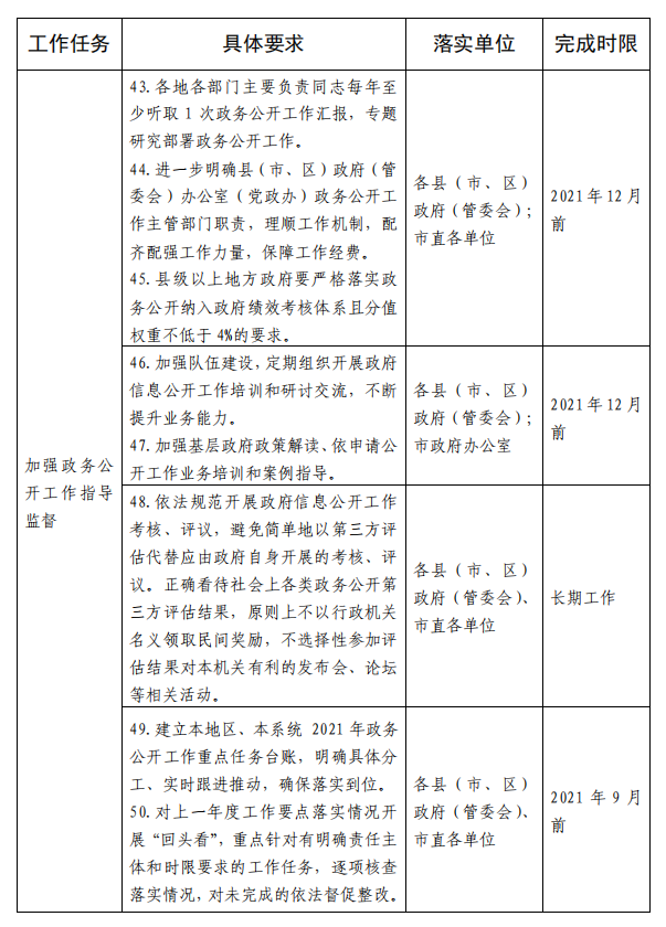 三、各级政府和市直有关部门要加强政务公开经费保障和人员配备,确保政务公开工作有人抓、有人管。要密切关注本地区、本系统推动工作形成的好经验好做法,及时总结推广。要将政务公开工作任务落实情况纳入政府信息公开年度报告予以公开,接受社会监督。市政府办公室将加强监督考核,把落实情况作为重要内容纳入政务公开工作考评。