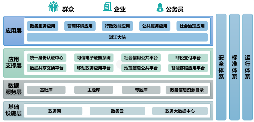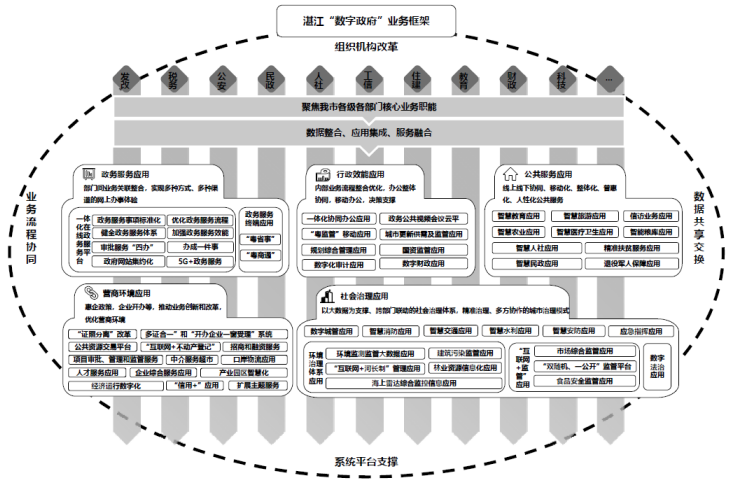 在省数字政府规划的总体框架下,湛江市以“精湛服务,精品支撑,精准保障”为思路,通过数字化、智能化、智慧化信息技术,在政务服务、行政效能、营商环境、公共服务、社会治理五大领域服务湛江社会经济高质量发展,对全市的数字政府进行总体规划。