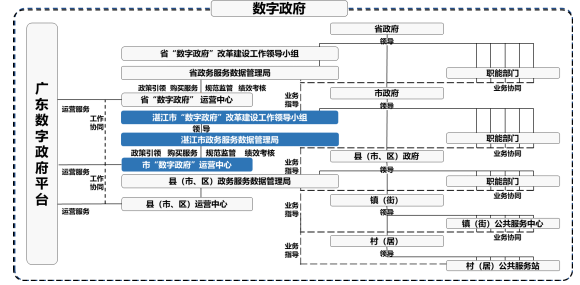 建成上接省、下联县(市、区)、横向到边、纵向到底全覆盖的数字政府,推动湛江市“放管服”改革向纵深发展。推进政务信息化建设体制改革,构建“管运分离”的数字政府建设管理新体制。