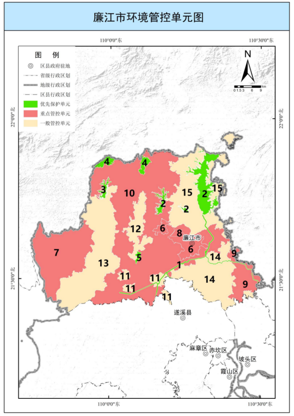 全市共划定陆域环境管控单元89个,其中,优先保护单元23个,面积563.13平方公里,占全市陆域国土面积的4.25%,主要涵盖生态保护红线、一般生态空间、饮用水水源保护区、环境空气质量一类功能区等区域,主要分布在廉江北部丘陵山地生态屏障,雷州半岛中部林地生态屏障,以及南渡河、雷州青年运河、鉴江干流、鹤地水库、东吴水库、龙门水库、大水桥水库等饮用水水源保护区,与市域生态安全格局基本吻合;重点管控单元40个,面积5193.66平方公里,占全市陆域国土面积的39.15%,主要包括工业集聚、人口集中和环境质量超标区域;一般管控单元26个,面积7507.77平方公里,占全市陆域国土面积的56.60%,为优先保护单元、重点管控单元以外的区域。