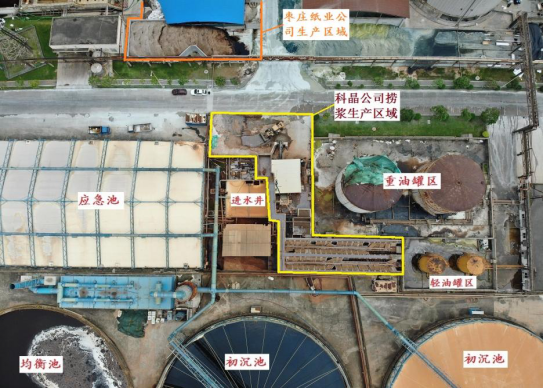 科晶公司捞浆作业区域布置在湛江晨鸣公司污水一期设施的进水井、初沉池与原重油、轻油罐区之间的原通道部分的狭窄部位,北向为污水装置的进水井、初沉池,西向为重油、轻油罐区、东向依次为污水进水井及应急池,南向的道路一侧有枣庄鑫诚纸业有限公司厂区。科晶公司捞浆装置界区及周边装置情况如图4所示。黄线界区内为科晶公司捞浆作业区域,周边均为湛江晨鸣公司生产设施。