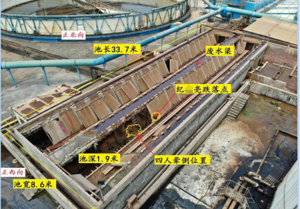 因捞浆作业通道过窄、平台防护栏杆缺失,纪某亮在捞浆作业时不慎跌落集水池(有限空间),集水池内氧气含量不足,纪某生、纪某翔和王某法盲目涉水进入池内施救,池底污泥搅动后释放出硫化氢和一氧化碳,四人窒息、中毒后晕倒在污水中淹溺,抢救无效死亡。
