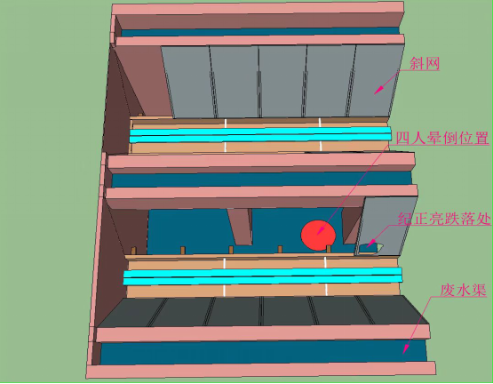 斜网捞浆装置空间布局分上下两个部分,上部为斜网捞浆作业区,作业区分为相对独立的南、北两个作业区,斜网下部为集水池。纪某亮跌落点位于南作业区西向起第6张斜网位置(如图6所示)。
