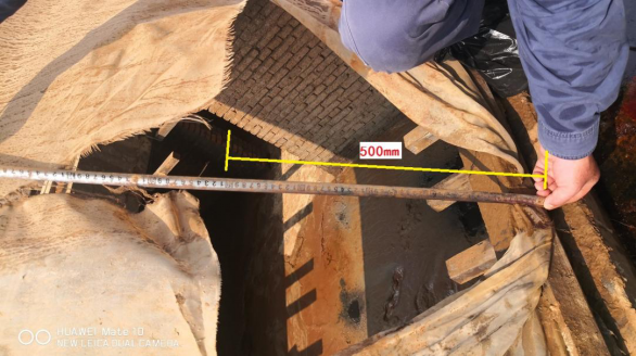 经现场勘查和气体检测,浆渣收集区域作业通道及集水池未检测出有毒气体,在旁边未发生事故的集水井检测出微量氨气。事发时纪某亮在通道进行斜网清洗作业,作业及通道平台宽0.35米,渣浆沟深0.4米,沟面敞开无防护,通道没有设置防护栏。纪某亮身高1.71米,现场斜网穿破口中心位于斜网边框上方0.5米处,由此可以排除纪某亮从槽钢平台或渣浆沟直接跌落集水池的可能;渣浆沟深0.4米,技术组推断,纪某亮在西侧起第6块斜网处脚踏空踩入渣浆沟、身体失去平衡后侧倒落入积水池。斜网穿破情况如图13所示。