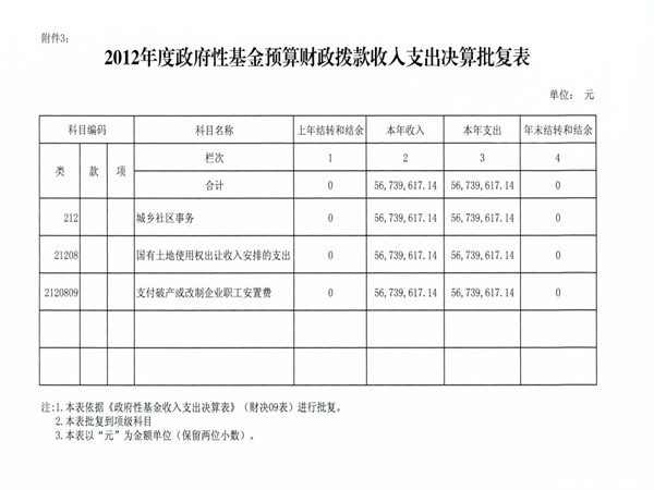 2012年度政府性基金预算财政拨款收入支出决算批复表