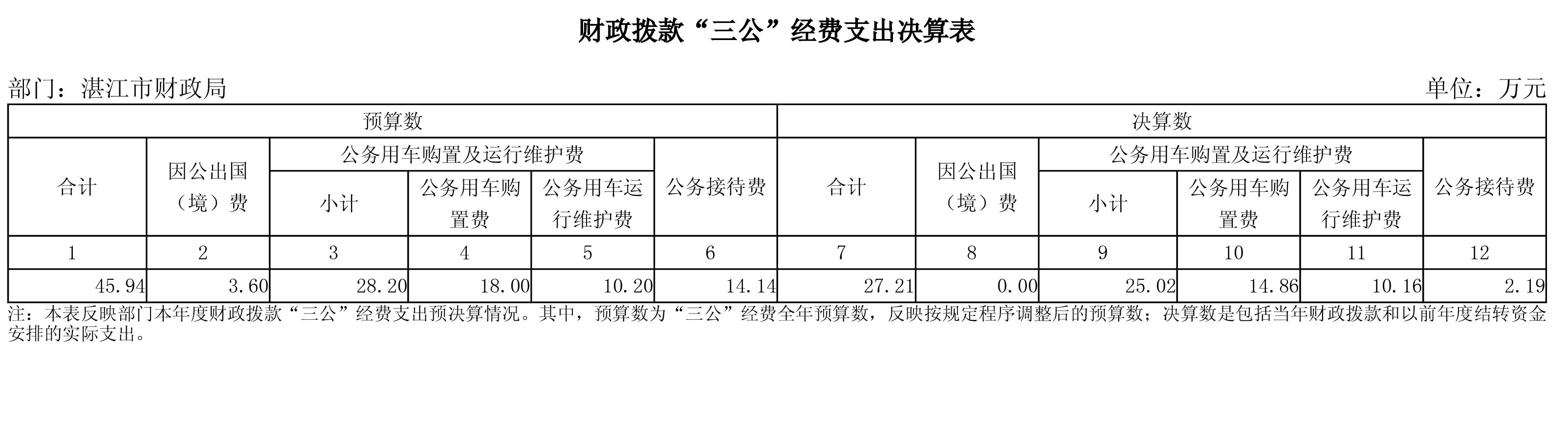 湛江市财政局2023年度“三公”经费财政拨款支出决算为27.21万元,完成全年预算45.94万元的59.2%,比上年决算数增加16.43万元,增长152.3%。其中:因公出国(境)费支出决算为0万元,完成预算3.6万元的0%,比上年决算数增加0万元,增长0%;公务用车购置及运行维护费支出决算为25.02万元,完成预算28.2万元的88.7%,比上年决算数增加16.37万元,增长189.3%;其中:公务用车购置支出决算为14.86万元,完成预算18万元的82.6%,比上年决算数增加14.86万元,增长100%,增长原因是2023年根据《关于转发广东省机关事务管理局广东省财政厅关于开展第二批以“统采分签”模式推动公务用车应用新能源汽车工作的通知》(湛管〔2023〕13号),经报请批准,我局购买一辆纯电公务用车;公务用车运行维护费支出决算为10.16万元,完成预算10.2万元的99.6%,比上年决算数增加1.51万元,增长17.5%,增长原因:一是2023年支付3辆公车2022年11月-2023年11月车载终端设备服务费4104元,属于一次性项目;二是汽车修理厂跨年请款,导致2023年公务用车运行维护费支出含2022年公车修缮费1.24万元;公务接待费支出决算为2.19万元,完成预算14.14万元的15.5%,比上年决算数增加0.06万元,增长2.6%,增长原因是2022年受新冠本土疫情影响,我局2022年公务接待费较往年偏低;2023年公务接待费较疫情前2019年决算数减少2.05万元,下降48.3%。