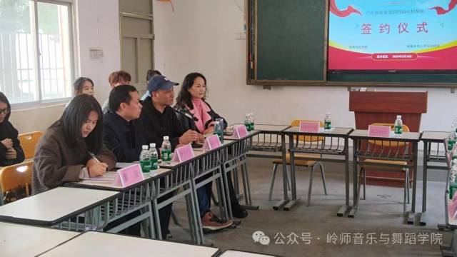 岭南师范学院教务处副处长尹宁伟、岭南师范学院音乐与舞蹈学院副院长兼教授朱培科、岭南师范学院教务处副科长翟童、岭南师范学院音乐与舞蹈学院副教授彭桂明、麻章镇赤岭小学副书记梁宏登、麻章镇赤岭小学迈合校区主任冯立盈,以及11位岭南师范学院音乐与舞蹈学院2022级音乐学专业学生参与协议签署会议。