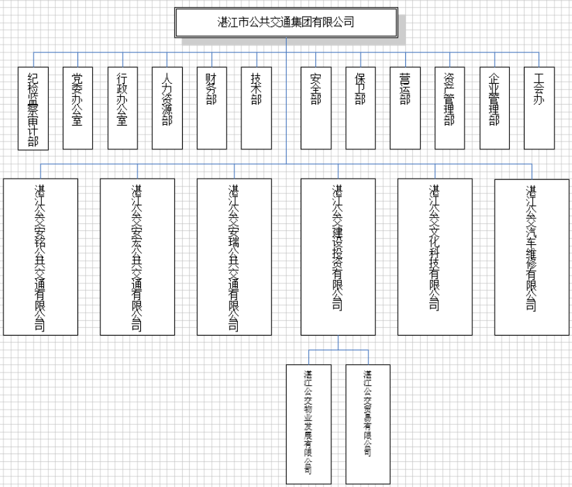 湛江市公共交通集团有限公司是湛江市经营城市公共汽车客运的国有独资企业,成立于1951年,隶属于国资委。在职员工1202人,包括行政管理人员89人、后勤和一线员工1113人(后勤和一线员工中,驾驶员644人,修理工、调度员、值勤员等后勤服务岗位469人)。下设12个职能部门、6家子公司。公交车辆774辆(其中89.3%为新能源电动公交车),公交线路53条,公交线路服务里程1052.3公里。