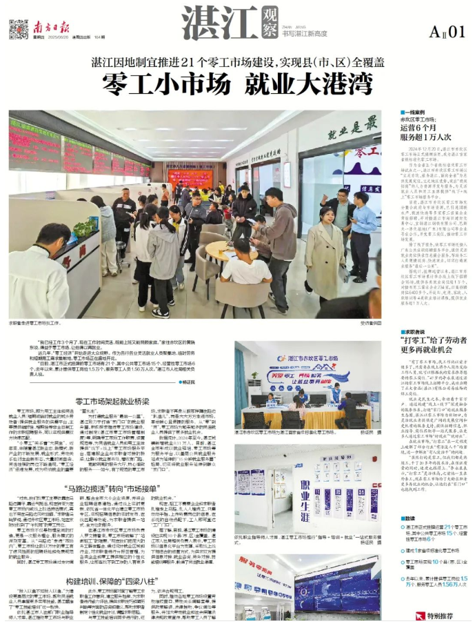 零工市场,即为用工主体和灵活就业人员(短期或临时就业的城乡劳动者)提供就业服务的供需平台,主要提供临时性、短期性等非全日制工作的求职招聘服务,可以实现供需双方快速匹配。 “小零工”关系着“大民生”。近年来,伴随着湛江新业态、新模式、新产业的不断发展,就业形式、劳动关系也衍生出新形态,大量时间自由、灵活性强的岗位不断涌现,“零工经济”迅速发展,成为吸纳就业的重要“蓄水池”。 为打通就业服务“最后一公里”,湛江致力于打造“家门口”的就业服务圈,积极探索推进零工市场建设,通过制定《湛江市零工市场管理制度》等,明确零工市场工作职责、运营规范等,为灵活就业人员和用工主体提供“线下+线上”零工市场服务平台,搭建起企业与求职者对接的桥梁,让群众就业有去处、增收有门路。 宽敞明亮的服务大厅、热心细致的服务……如今,有了规范的零工市场,求职者不再像从前那样蹲在路边“趴活儿”,而是大大方方走进市场,享受暖心且便捷的服务。从“零”到“灵”,零工市场为越来越多的灵活就业人员提供了更多就业机会。 数据统计,2024年至今,湛江城镇新增就业8.11万人。目前,湛江全市形成以就业驿站、零工市场等为服务平台,以基层公共就业服务站点为延伸的“15分钟就业服务圈”格局,切实将就业服务延伸到群众“家门口”。 “过去,我们找零工主要依靠在马路边蹲守、靠运气揽活,现在转变为在零工市场内或线上找活接活模式,再也不用在马路边风吹日晒。”求职者冯晓梦说,通过赤坎区零工市场,她在家附近找到了“午托班”的零工岗位。 零工市场不仅是物理空间的打造,更是一次服务理念、服务模式的深刻变革。从“马路边”走进“市场内”,零工市场让数以万计的零工有了遮风挡雨的招聘场地和免费规范的就业服务。 同时,湛江零工市场通过走访调研,整合全市大小企业资源,并将企业招聘信息建档,通过线上实时更新,依托省一体化平台建立零工市场专区,实现招聘信息的实时发布、在线匹配等功能,为求职者提供一站式、全方位的服务。 在湛江市赤坎区零工市场负责人罗文锦看来,零工市场破解了“站街招工”的难题。“现在我们把庞大的务工群体整合,通过统计就业区域和行业,对求职者进行分标签管理,为各类企业和零工提供相应的个性化服务,让那些找不到工作的人有更多的就业机会。” 现在,招工不需要企业和求职者扎堆走上马路,扎入人堆选工,只需动动手指,上传所需岗位的信息,在系统的自动选配下,工人即可直达“工厂门口”。 据了解,目前,湛江零工市场的建设已实现10个县(市、区)全覆盖。湛江市人社局相关负责人表示,零工市场以信息化平台为支撑,采取线上线下相结合的运营方式,为供求双方提供信息对接、就业咨询、劳务对接、技能培训等服务,畅通了灵活就业渠道。 “授人以鱼不如授人以渔。”为建设更高层次的零工市场,帮助灵活就业人员掌握更多实用技能,湛江瞄准了“零工技能培训”这一板块。 依托湛江市人社部门职业指导师人才库,湛江推动零工市场与职业技能培训机构深度合作,形成“指导+培训+就业”一站式服务模式,组织创新创业导师、人力资源师、技能培训讲师等专业人才进驻零工市场,定期开展定制式职业技能培训、创业培训和再就业培训,提升求职者就业竞争力和创业能力。 此外,零工市场面对面了解零工求职者工作意向,建立服务档案,为求职者进行能力评估,提供求职技巧和简历判断等方面的咨询和建议,帮助求职者制定个性化就业计划,调整求职思路。 与零工技能培训同步进行的,还有对零工权益保障的探索。 为破解零工群体权益难保障问题,湛江充分发挥零工市场与人社、工会、市场监管、公安等职能部门的联动作用,建立健全灵活就业劳动者权益保障机制、纠纷争议快速调处机制,指导和督促用工主体规范招聘行为,依法合规用工。 同时,推动各地零工市场设置劳动维权窗口、劳动关系调解室等,提供政策解读、法律援助、争议调处等服务,并加大劳动就业和社会保障法律法规政策宣传,帮助零工人员了解自身权益,依法理性维权。 “目前,湛江市赤坎区零工市场正对接合作平安保险、支付宝、亚太财险等企业及平台,探索提供便捷的保险保障渠道方案,降低零工和用工主体的风险负担,示范带动湛江零工市场长期健康发展。”罗文锦说。 赤坎区零工市场: 运营6个月 服务超1万人次 2024年12月20日,湛江市赤坎区零工市场正式揭牌启用,成为湛江首家省级标准化零工市场。 作为全省五个省级标准化零工市场试点之一,湛江市赤坎区零工市场以“立足赤坎、服务湛江、面向全省”为总体发展定位,立足地区优势,突出“稳岗拓岗”的人力资源开发与服务,为灵活就业人员和用工主体提供“线下+线上”零工市场服务平台。 目前,湛江市赤坎区零工市场充分整合政府与市场资源,已引进国联水产、极速快递等多家零工密集企业常驻招聘,并对接湛江市海田建材交易中心、宝钢湛江钢铁有限公司、巴斯夫一体化基地(广东)有限公司等企业寻求合作,开发零工岗位,推动零工市场发展。 除了线下服务,该零工市场还接入广东公共求职招聘服务平台,提供灵活就业岗位供求信息撮合服务,帮助务工人员便捷返岗、快速就业,切实打通就业服务“最后一公里”。 据