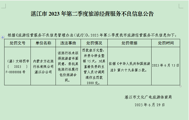 湛江市2023年第二季度旅游经营服务不良信息公告