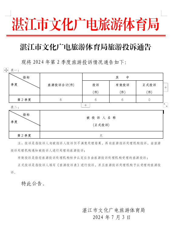 湛江市文化广电旅游体育局2024年第二季度旅游投诉通告