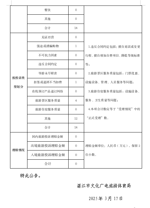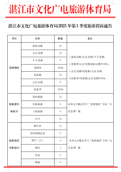 湛江市文化广电旅游体育局2025年第1季度旅游投诉通告