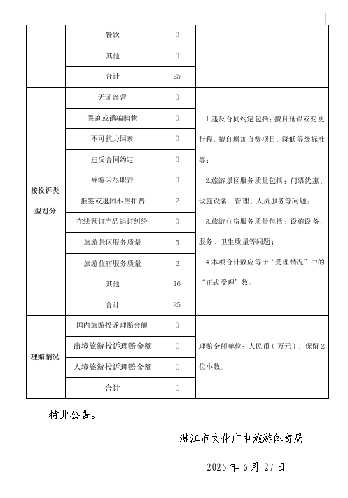 湛江市文化广电旅游体育局2025年第2季度旅游投诉通告