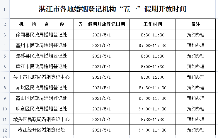 湛江市各地婚姻登记机构“五一”假期开放时间