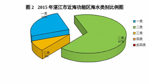 2015年,覆盖整个湛江市近岸海域的12个功能区监测点位(二类功能区点位10个、三类功能区点位2个),水质均达到相应的水质目标要求,水质总体良好,水质类别以二类海水为主,其中一类海水占25.0%、二类海水占66.7%、三类海水占8.3%。与去年同期相比,湛江市近岸海域功能区水质保持稳定。