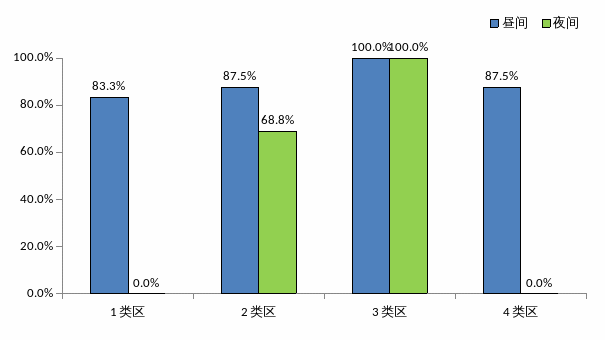 2015年全市15个功能区声环境监测达标率分别为:1类区昼间为83.3%,夜间为0%;2类区昼间为87.5%,夜间为68.8%;3类区昼间为100%,夜间为100%;4类区昼间为87.5%,夜间为0%。