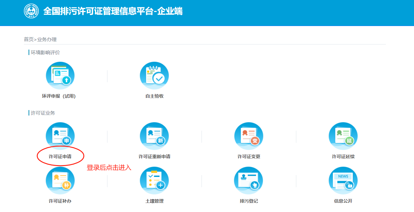 排污单位登录全国排污许可证管理信息平台-公开端,点击导航栏的“网上申报”栏目,进入“国家排污许可证管理信息平台-企业端”页面注册,并用此账户登录,进入“业务办理-许可证申请”模块。