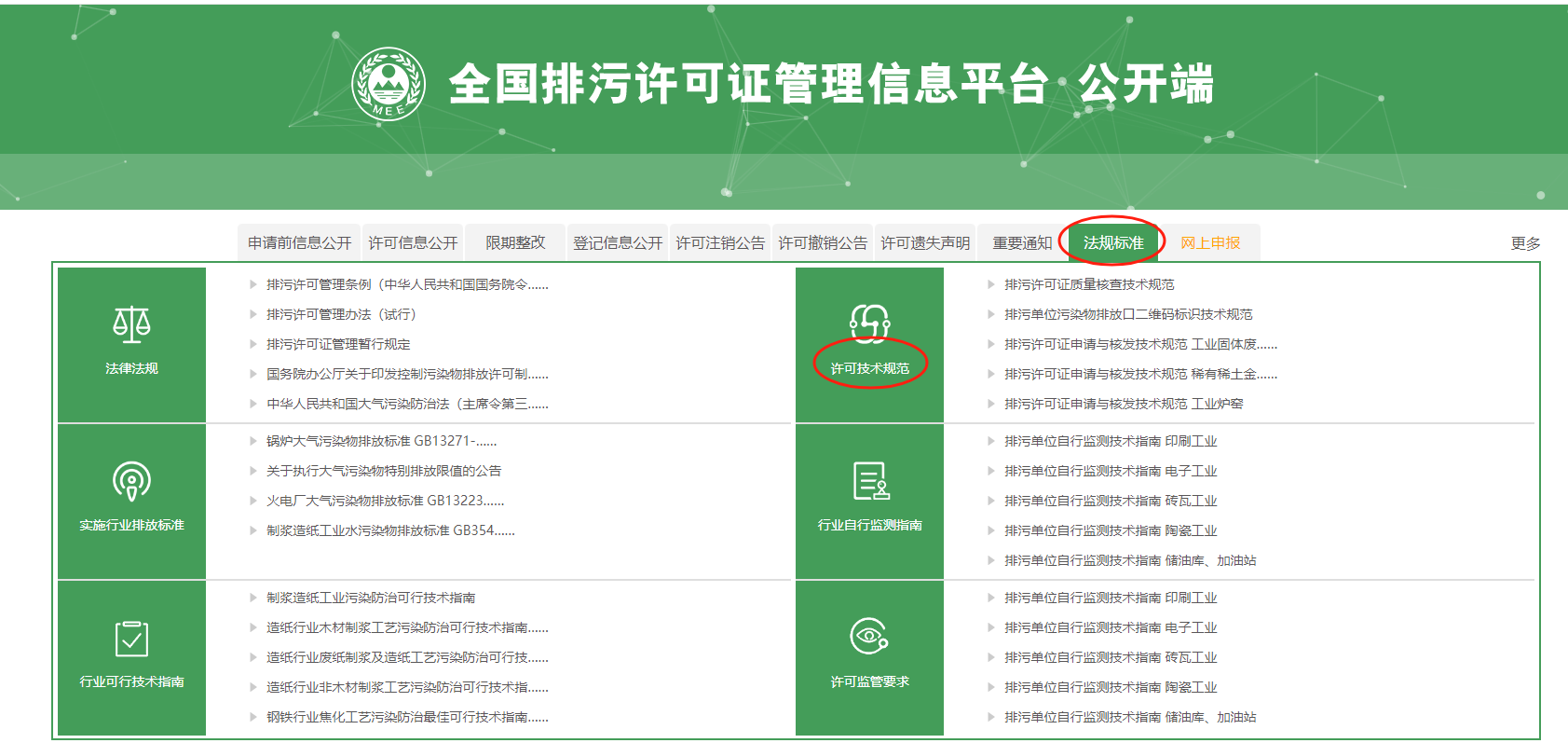 有关排污许可证申请与核发的技术规范,请登录全国排污许可证管理信息平台(网址同上),点击“法规标准”--许可技术规范查阅。