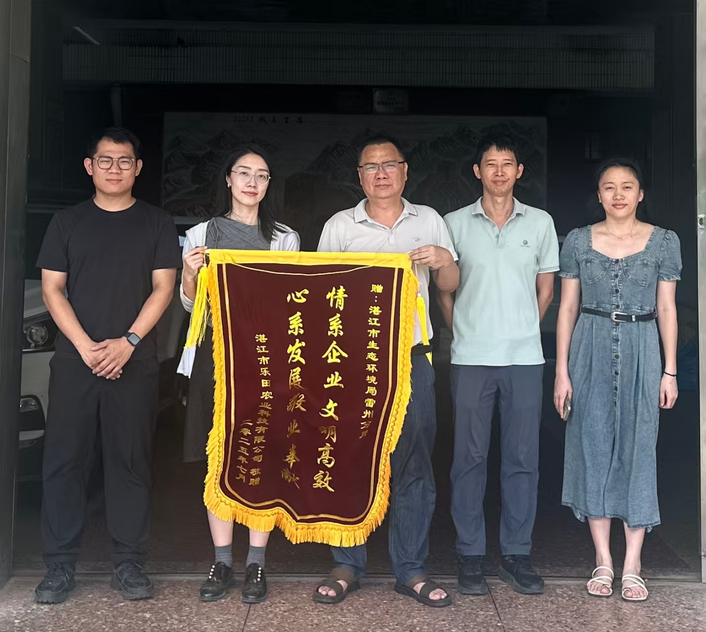 近日,湛江市生态环境局雷州分局为湛江市乐田农业科技有限公司同时发放环评批复和排污许可证,2025年湛江市首个环评和排污许可“两证审批合一”案例成功落地,企业将一面印有“情系企业 文明高效 心系发展 敬业奉献 ”锦旗送到雷州分局。