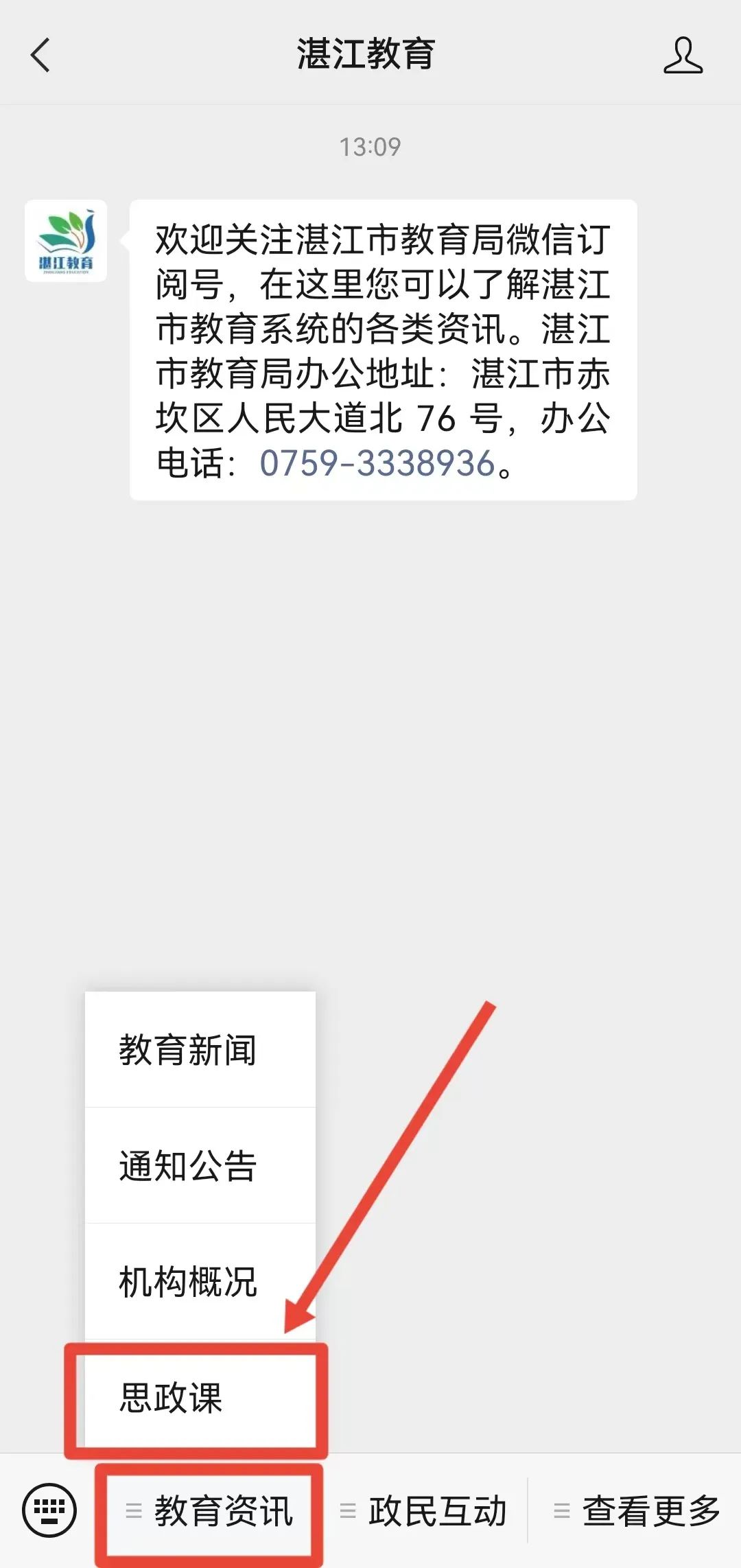 2.关注“湛江教育”微信公众号,点击菜单栏“教育资讯”——“思政课”可随时收看回放。