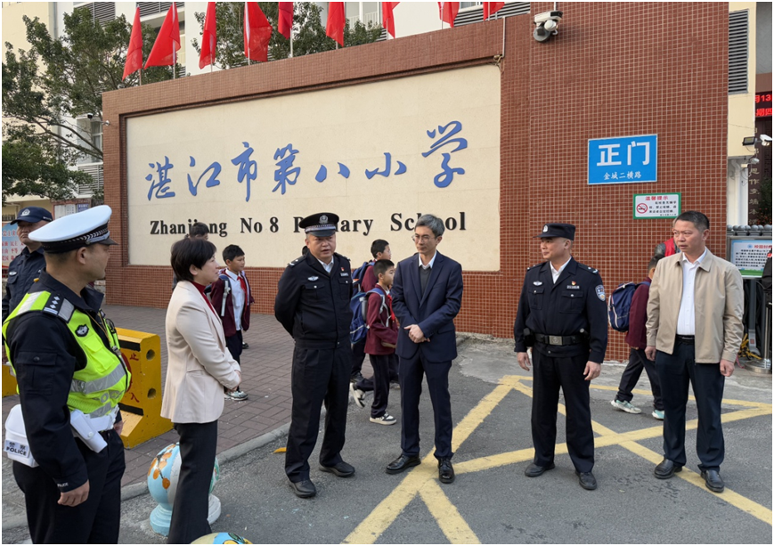 当天,作为湛江市第八小学的法治副校长,副市长、市公安局局长国涛到湛江市第八小学金城校区执行高峰勤务,与公安民警交警、学校值班人员、保安员、家长志愿者共同参与护学,有序疏导返校车流人流,倡导家长遵守交通法规,确保学生返校安全。国涛副市长与市教育局陈升局长现场检查督导“护校安园”和“三见警”工作,就校园安全工作进行深入交流。接下来,公安部门与教育部门将进一步深化合作,把交通安全教育有机融入“三个习惯”培育养成中,提升学生的安全意识。