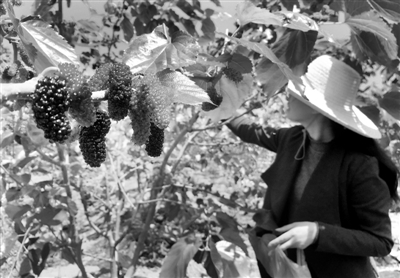 21日,坡头官渡镇山嘴村精准扶贫项目种植基地里,游客正在采摘桑葚