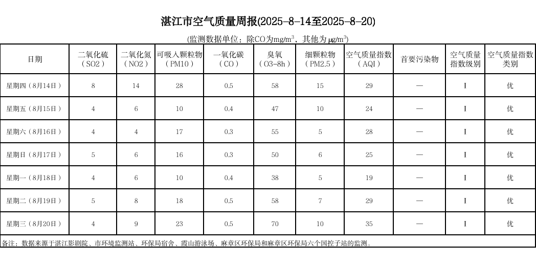 湛江市空气质量周报(2025-08-14至2025-08-20)