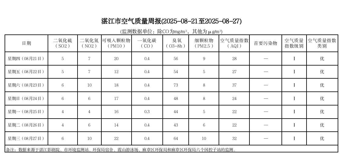 湛江市空气质量周报(2025-08-21至2025-08-27)
