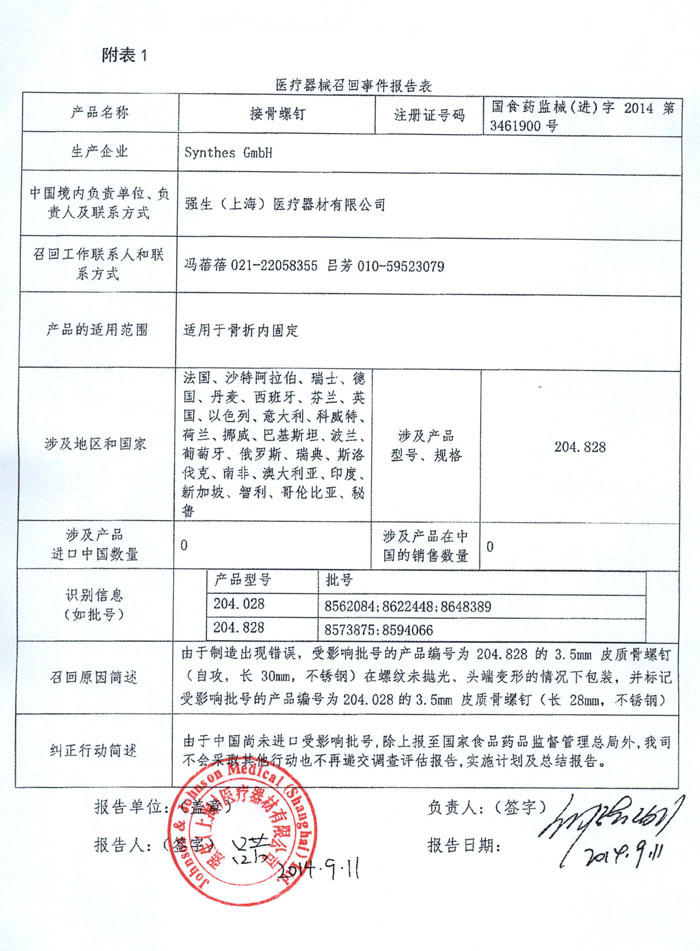 2014年9月15日收到强生(上海)医疗器材有限公司报告,该公司代理的接骨螺钉(注册证号:国食药监械(进)字2014第3461900号)由于制造出现错误等原因,其生产商瑞士Synthes GmbH公司对该产品进行主动召回。该公司称此次召回产品未在中国销售。请各省、自治区、直辖市食品药品监督管理局加强对此类产品的监督管理。