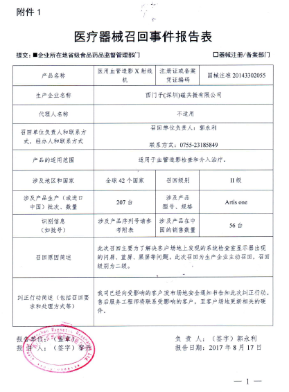 西门子(深圳)磁共振有限公司报告,由于医用血管造影X射线机的系统检查室显示器出现闪屏、蓝屏、黑屏等原因,西门子(深圳)磁共振有限公司对其生产的医用血管造影X射线机(注册号:国械注准20143302055)主动召回。召回级别为二级。涉及产品的型号、规格及批次等详细信息见《医疗器械召回事件报告表》。