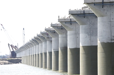 东海岛铁路通明湾特大桥建设中。记者 郑锋 摄