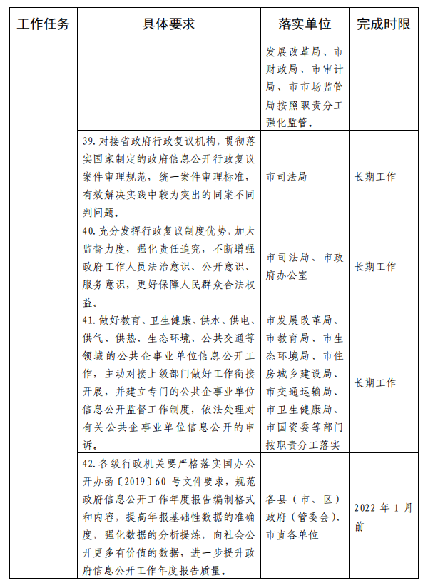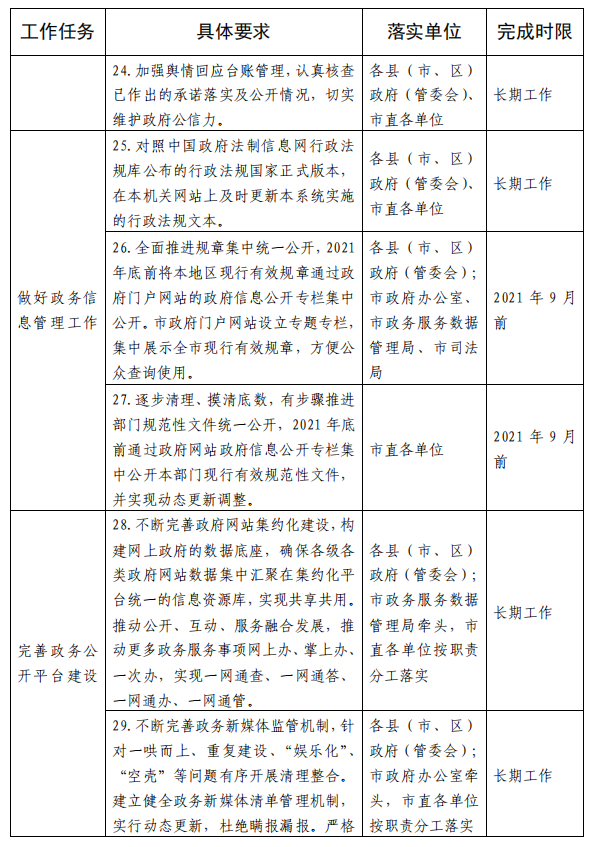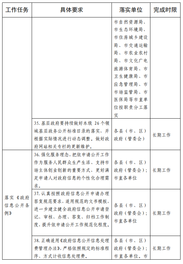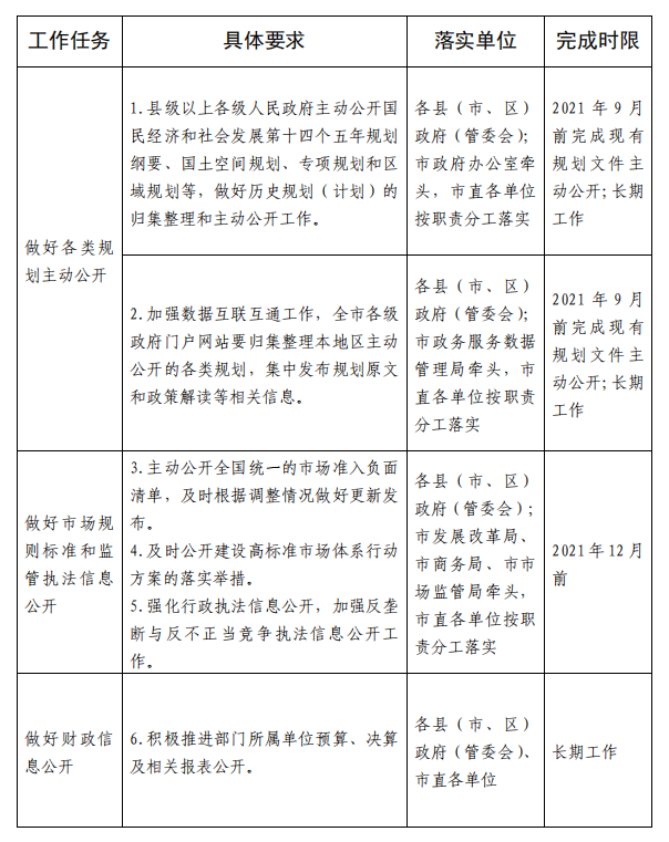 二、各牵头单位要切实扛起牵头抓总职责,主动加强与上级有关部门的请示对接,加强对本系统政务公开工作的指导,协调责任单位同向发力,按时保质保量完成各项工作任务,并于10月30日前收集汇总所牵头工作任务开展情况,报市政府办公室。