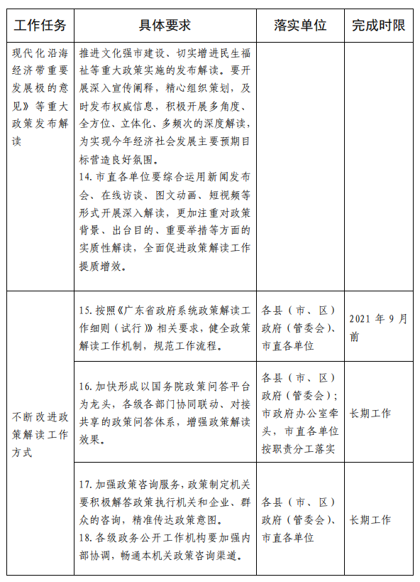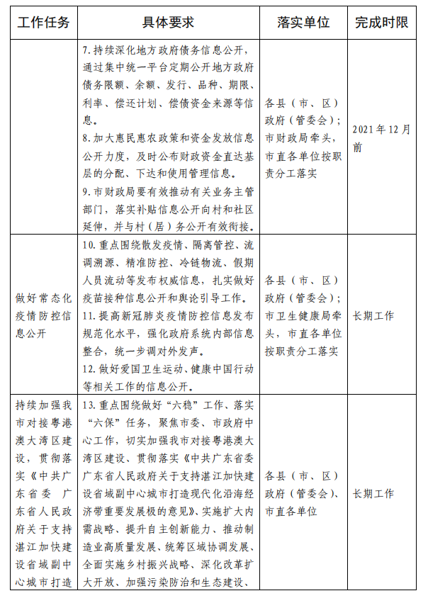 为贯彻落实《国务院办公厅关于印发2021年政务公开工作要点的通知》(国办发〔2021〕12号)和《广东省人民政府办公厅关于印发广东省贯彻落实国务院办公厅2021年政务公开工作要点分工方案的通知》(粤府办〔2021〕17号)要求,经市政府同意,现将《湛江市2021年政务公开工作要点分工方案》印发给你们,请结合以下工作要求,迅速抓好贯彻落实。