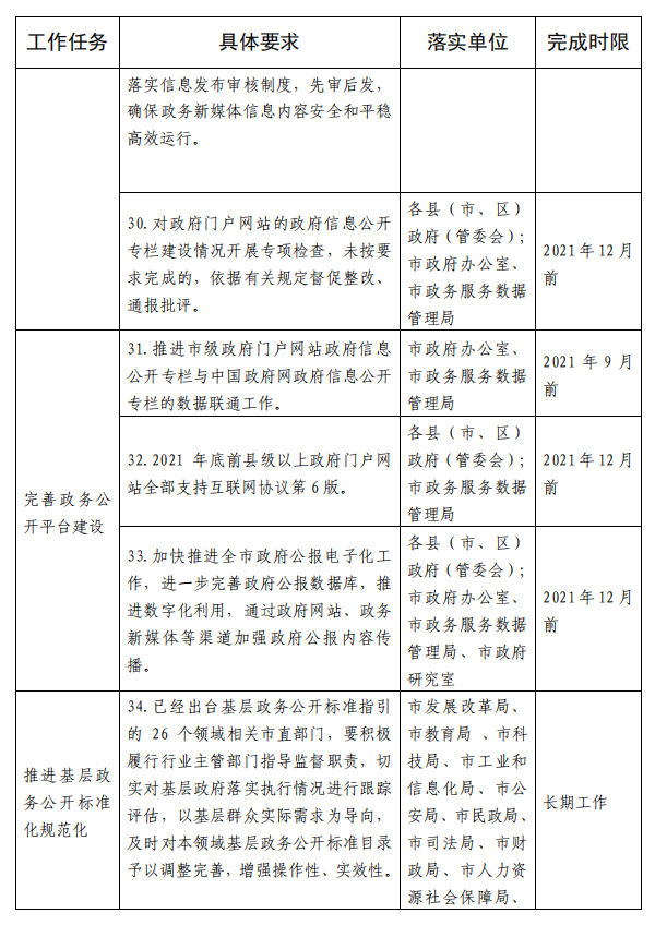三、各级政府和市直有关部门要加强政务公开经费保障和人员配备,确保政务公开工作有人抓、有人管。要密切关注本地区、本系统推动工作形成的好经验好做法,及时总结推广。要将政务公开工作任务落实情况纳入政府信息公开年度报告予以公开,接受社会监督。市政府办公室将加强监督考核,把落实情况作为重要内容纳入政务公开工作考评。