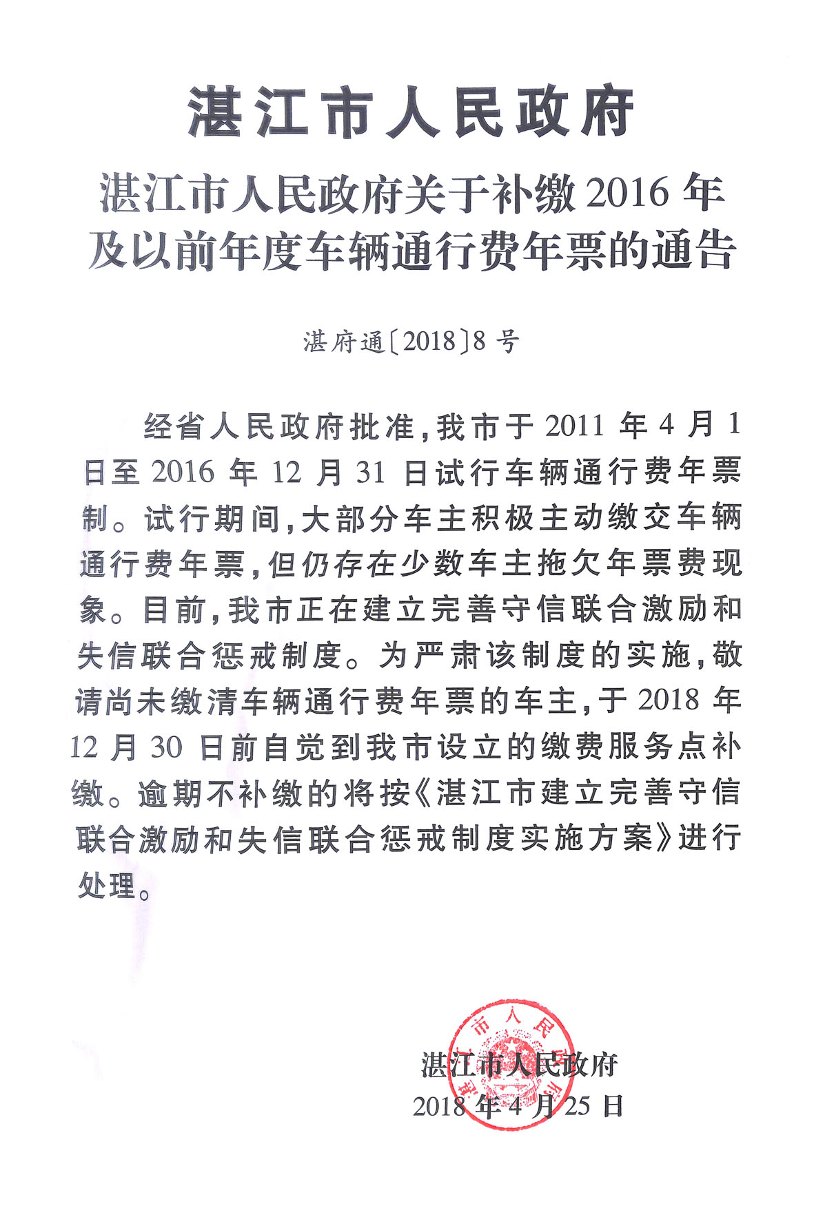 亚洲体育博彩平台关于补缴2016年及以前年度车辆通行费年票的通告