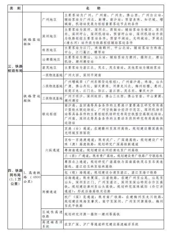 完善城际铁路网。构建以广佛、深港、珠澳三大发展极为核心,以广深港、广珠澳、跨珠江口三大主轴为集聚的城际铁路网,打造“轨道上的大湾区”。加快形成粤东城际铁路主骨架。研究粤西地区利用既有铁路提质改造开行城际或市域(郊)列车。研究连通北部生态发展区重要客运枢纽和重点景区的特色慢游城际铁路网。