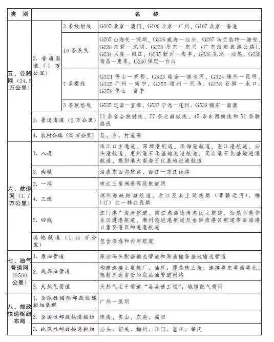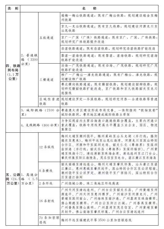 加快干线铁路网建设。构建“六纵两横”高速铁路干线格局,完善“五纵三横”普速铁路干线,贯通沿海、包(银)海等国家级高铁通道,强化与长三角、京津冀、成渝、长江中游、北部湾等城市群和海南自由贸易港的联通,构建以粤港澳大湾区为核心,联系粤东粤西粤北地区并对外延伸辐射的干线铁路出省通道格局。