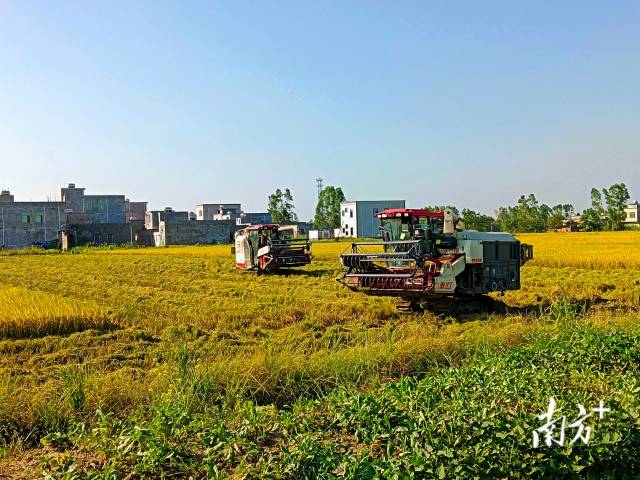 被誉为“广东粮仓”的雷州市东、西洋正处在稻谷收获的季节,在雷州市松竹镇王宅村,农民们迎来了令人喜悦的丰收。金黄稻田如同铺展在大地上的壮丽画卷,成熟的稻谷随风摇摆,金色浪潮随之在大地上翻腾。远处,收割机轰鸣着在稻田里往返,饱满的稻穗被带走,象征着从播种到收割的又一个循环落下了帷幕。