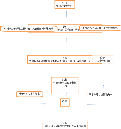 1.受理。能当场受理或通过当场补正达到受理条件的,县级以上农业农村主管部门直接受理。根据一次性告知通知书内容,进行补正后达到受理条件的,进入受理环节。审批时限:符合受理条件1个工作日。