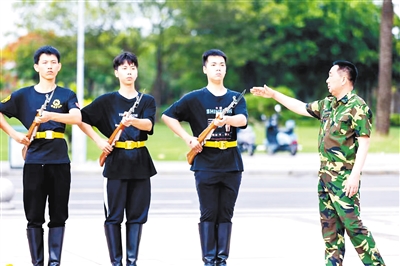 董立敢指导湛江科技学院国旗护卫队的同学们开展训练。