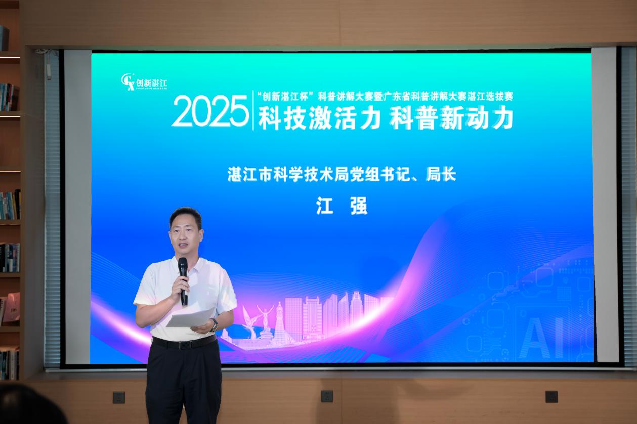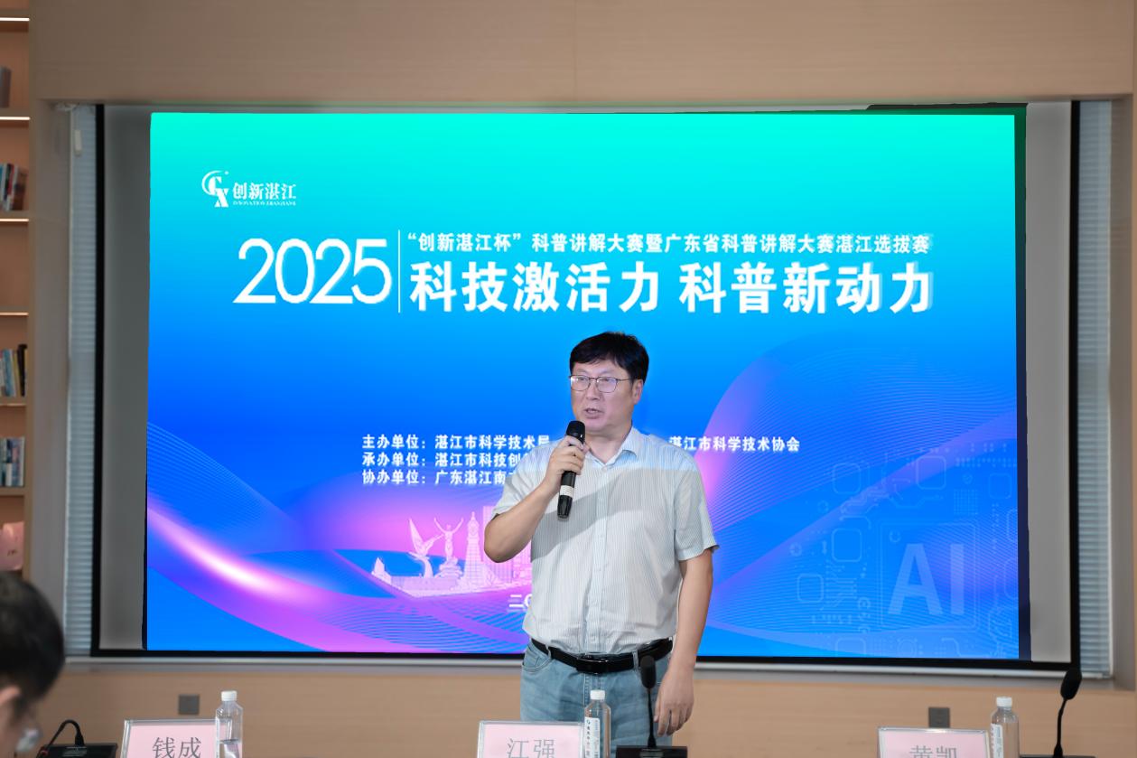 湛江市科学技术局党组书记、局长江强做总结讲话。他强调,大赛不仅是科普人才的“练兵场”,更是科学精神传播的“播种机”。湛江作为海洋经济大市,需依托赛事挖掘更多“懂科技、善表达”的复合型人才,推动 “深海科技”“临港产业”等特色领域科普内容的大众化传播。