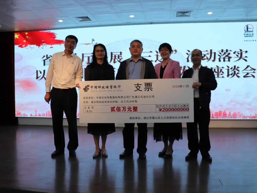 在随后召开的座谈会上,霞山区委常委李小军、开发区组织部副部长曹建毅等领导、湛江市君豪酒店、湛江口岸国际旅行社、汽车南站等企业代表和相关工作人员参加了座谈。会上,中国石化销售股份有限公司广东湛江石油分公司介绍了相关情况;霞山区汇报了各项人社暖企政策落实情况;市人社局局长黄真窦同志代表湛江市汇报了“三送”工作落实情况,在省人社厅调研组和市人社局领导见证下,霞山区委常委李小军向企业发放200万元的以工代训和适岗培训补贴资金支票,省人社厅调研组对我市支持企业复工复产,落实各项惠企政策减负担、保用工、促发展所取得成效表示充分肯定。