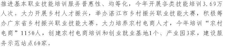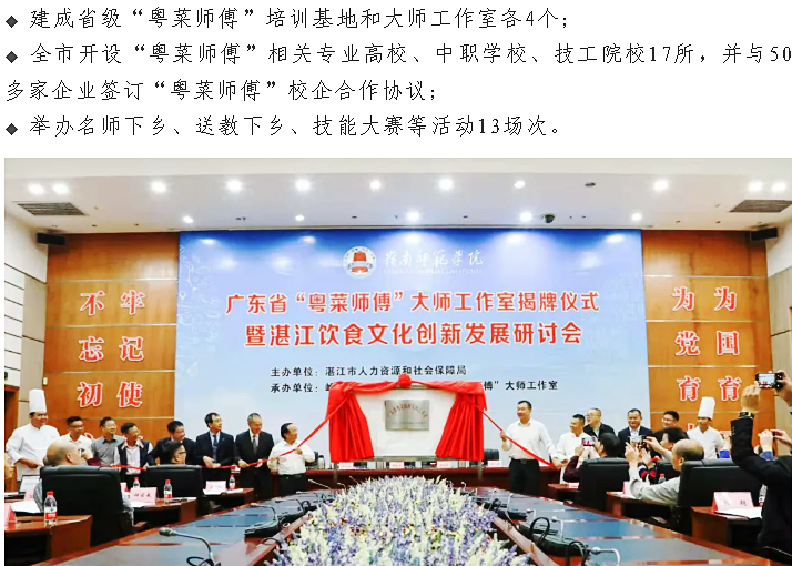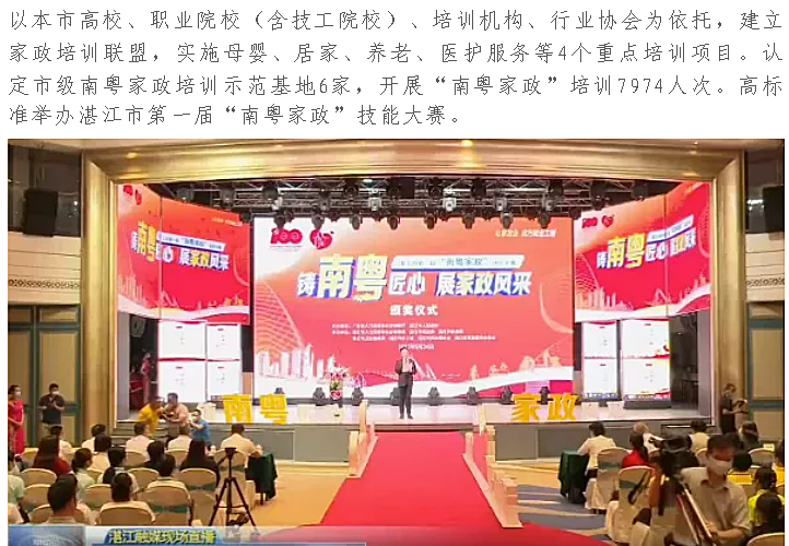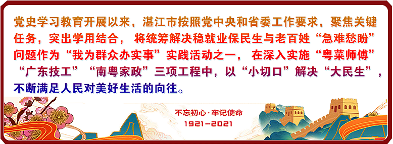 “粤菜师傅”整合特色农产品、乡村旅游等资源,打造富有湛江本地特色“粤菜师傅”“1+N”品牌,在助力乡村振兴、贫困人口和贫困村归零以及乡村第三产业发展方面发挥了重要作用。“广东技工”对接钢铁、石化、造纸等重大项目,今年来为重点项目输送本土技能人才1166人,为湛江制造业高质量发展提供人才支撑。“南粤家政”解决了重大项目建设大军到湛江的后顾之忧,为城市建设者展现了湛江城市宜居环境,彰显了湛江城市情怀与温度。
