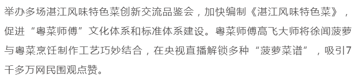 上半年,家政超市、社区家政服务群众达到5.18万人次。“粤菜师傅”工程挖掘湛江本土饮食文化、开发乡村旅游、研发健康美食等,不断满足新时代群众对健康生活、品质生活的需求。螺岗小镇、菠萝菜谱等“粤菜师傅+”品牌成为群众热捧的文化及美食大餐。